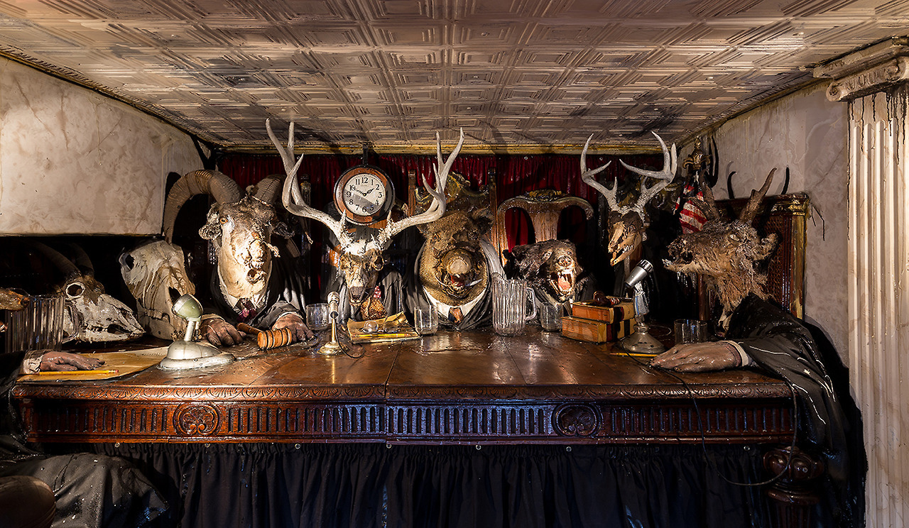 Comprised of skeletons and taxidermy animals posed in human form and donned in judicial robes, they are a gross representation of the American Supreme Court justices. Only one woman is portrayed. Distinguished by her high heels, she is relegated to the side of the scene as secondary to that of her male counterparts.