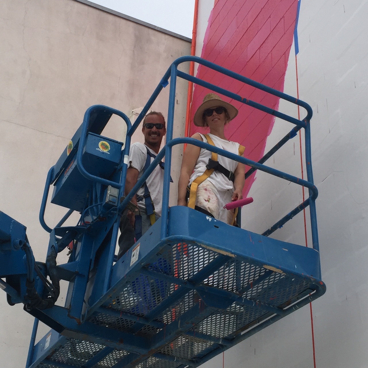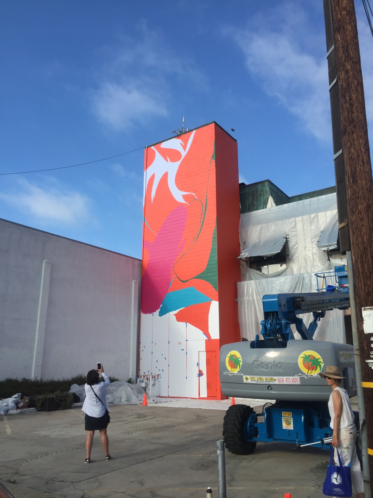 Heather Gwen Martin tackles her biggest “canvas” yet. Commissioned by the Murals of La Jolla, Martin has been chosen to paint a mural that measures three stories high and continues around the corner of the building, adding another level of complexity. Taking full advantage of the wall space, Martin animates its surface with varied shapes in brilliant colors. “This piece has an awareness of (itself), and the shape of the canvas is really interesting in that it allows strokes to join at the corners and move around,” said Martin. “You can see the two major sides and, for example, places where the dark green and lime green meet, like a pushing point to the other side. It wants to stop, but it doesn’t. Some of my paintings don’t end where the frame ends, they look like they could go on forever but have to end somewhere.” (Click here to read more on the mural project in the La Jolla Light).