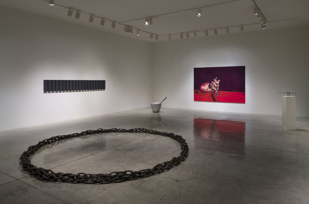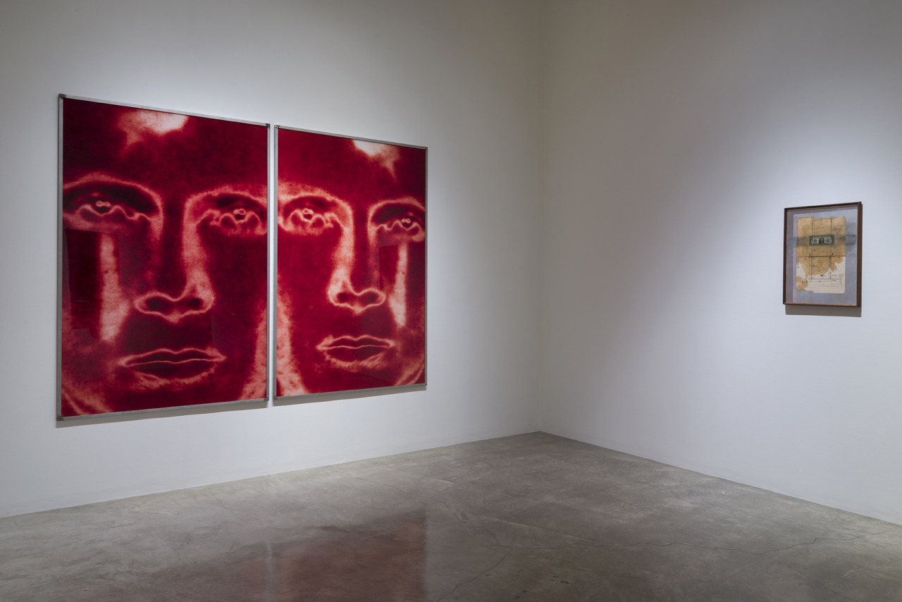 In the 1990s, L.A. Louver developed relationships with several more renowned artists, including one of Japan’s leading minimalist sculptors Toshikatsu Endo. As the centerpiece of Group Show, his “Untitled (Ring of Chain)” from 1995 perfectly sets the unifying theme of the show as it lays in a circle in the middle of the gallery floor. Endo began his relationship with gallery in 1993 with Toshikatsu Endo: New Work and 1996’s solo exhibition, Toshikatsu Endo. Another prominent artist who became involved with L.A. Louver in this era was British monochromatic painter Alan Charlton. His deconstructed piece “Painting in 20 Parts” from 1990 is included in the show, but his first exhibition with L.A. Louver, Alan Charlton: Four Walls Four Greys actually took place in 1991 at the gallery’s New York space. In the realm of photographic color prints, Czech artist Katharina Sieverding’s self-portrait “Stauffenberg-Block III/XI” 1969-96 is a captivating examination of the self and piece in the show. She first started exhibiting with L.A. Louver in 1997 with a series of similarly intriguing prints entitled Katharina Sieverding Stauffenberg-Block.