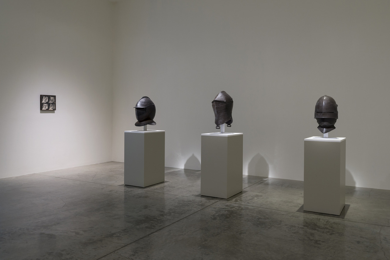 In 2001, L.A. Louver’s Founding Director Peter Goulds and Exhibitions Manager Christopher Pate began Rogue Wave Projects, a curatorial initiative aimed to celebrate emerging artists working in Los Angeles. The first group show featured 11 artists from Los Angeles including painter Kristin Calabrese, her enthralling perspective-based oil painting “Luck of the Draw” is currently presented in the gallery. Also discovered through this initiative is sculptor Ben Jackel, his helmet sculptures titled, “Closed Burgonet” and “Great Bascinet” from 2014 are also on display.