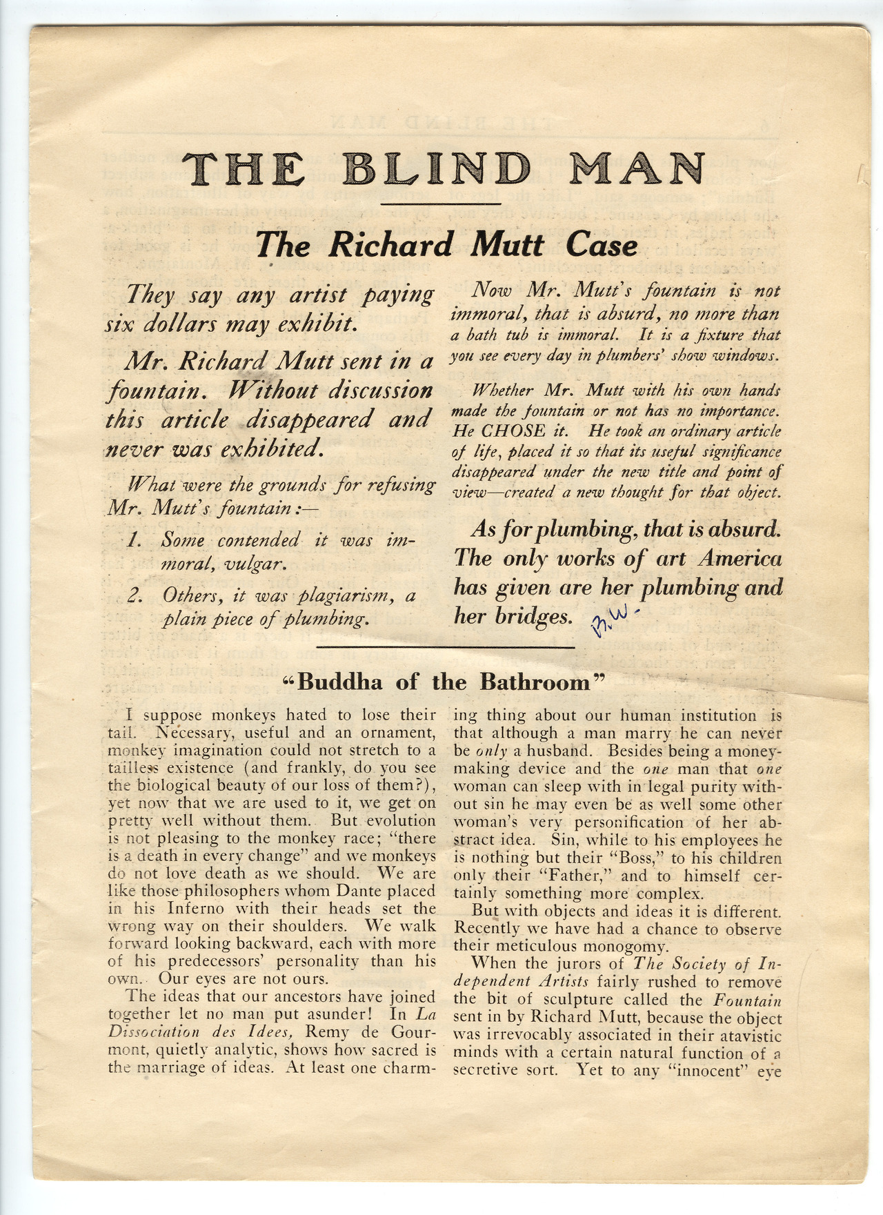 In the May 1917 issue of The Blind Man, a magazine edited by Pierre Roché, Wood and Duchamp, Wood authored an essay titled “The Richard Mutt Case,” in which she denounced the rejection of R. Mutt’s “Fountain” by the Society of Independent Artists. The accompanying image of the work was taken by Alfred Stieglitz.
